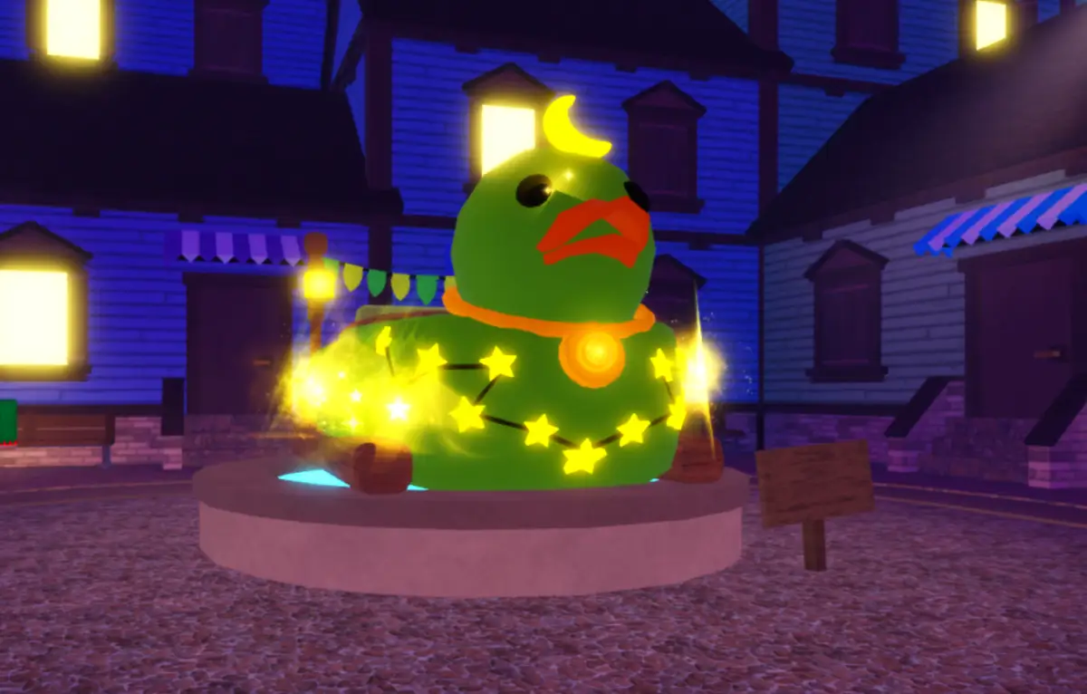 У уточки есть оранжевый ошейник с золотым кулоном-монетой на шее. Что действительно выделяет её, так это светящиеся желтые звезды, разбросанные по всему телу и сверкающие золотистыми эффектами. Всё это выглядит празднично и волшебно, особенно ночью, когда свечение становится очень ярким. Эта лодка действительно выглядит так, будто она часть празднования Ид, и именно это делает её особенной по сравнению с обычными лодками в Fish It.