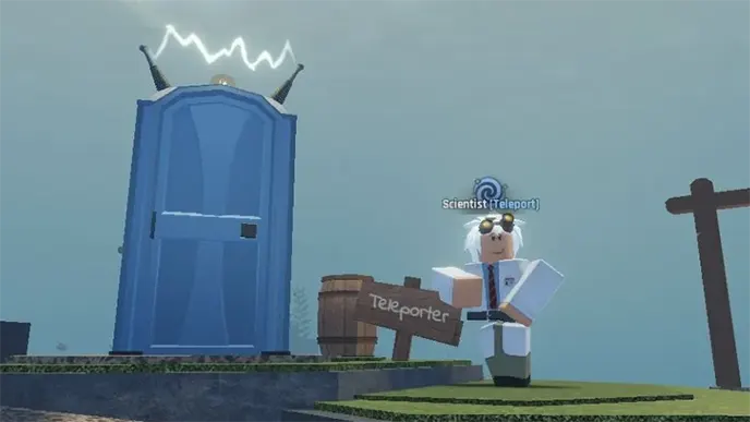 Чтобы разблокировать телепортацию, необходимо выполнить задание, которое даёт NPC Учёный (Scientist). Этот NPC находится справа от магазина гарпунов на стартовом острове. Просто подойдите к нему и нажмите клавишу E, чтобы начать диалог.