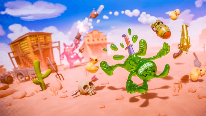 Если первая часть была просто странной дуэлью желейных человечков, то сиквел превзошел оригинал и в этом: теперь вы не просто стреляете, а буквально засасываете в оружие весь окружающий мир — от безобидных резиновых уточек и уютных кресел до бензопил, наковален и ядерных бомб. Всё это летит в противника под управлением фирменной «желейной физики», от которой персонажи разлетаются, сплющиваются и взрываются максимально комично.